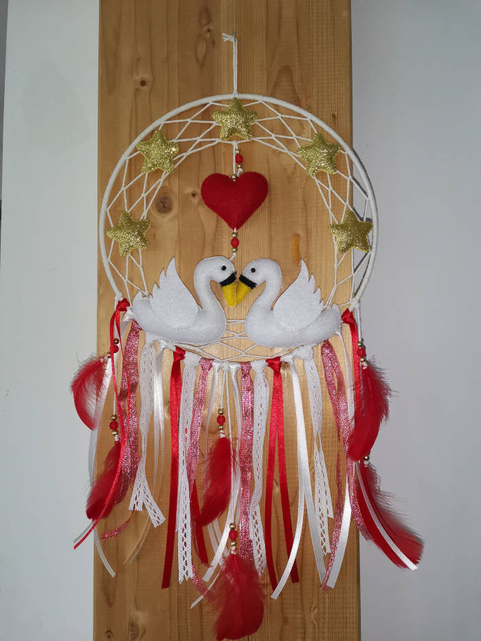 Attrape-rêves avec duo de cygnes, cœur en feutrine, et étoiles dorées pailletées.