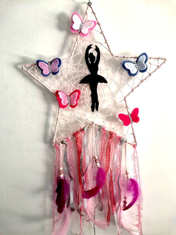 Attrape-rêves étoiles avec ombre de danseuse, papillons en feutrine, et guirlande lumineuse.