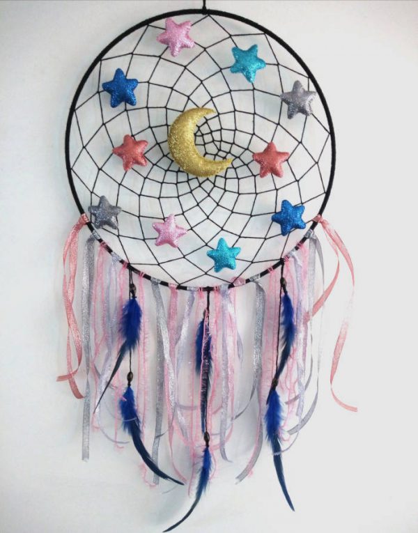 Attrape-rêves avec étoiles et lune en feutrine et simili cuir pailleté, plumes et perles assorties.
